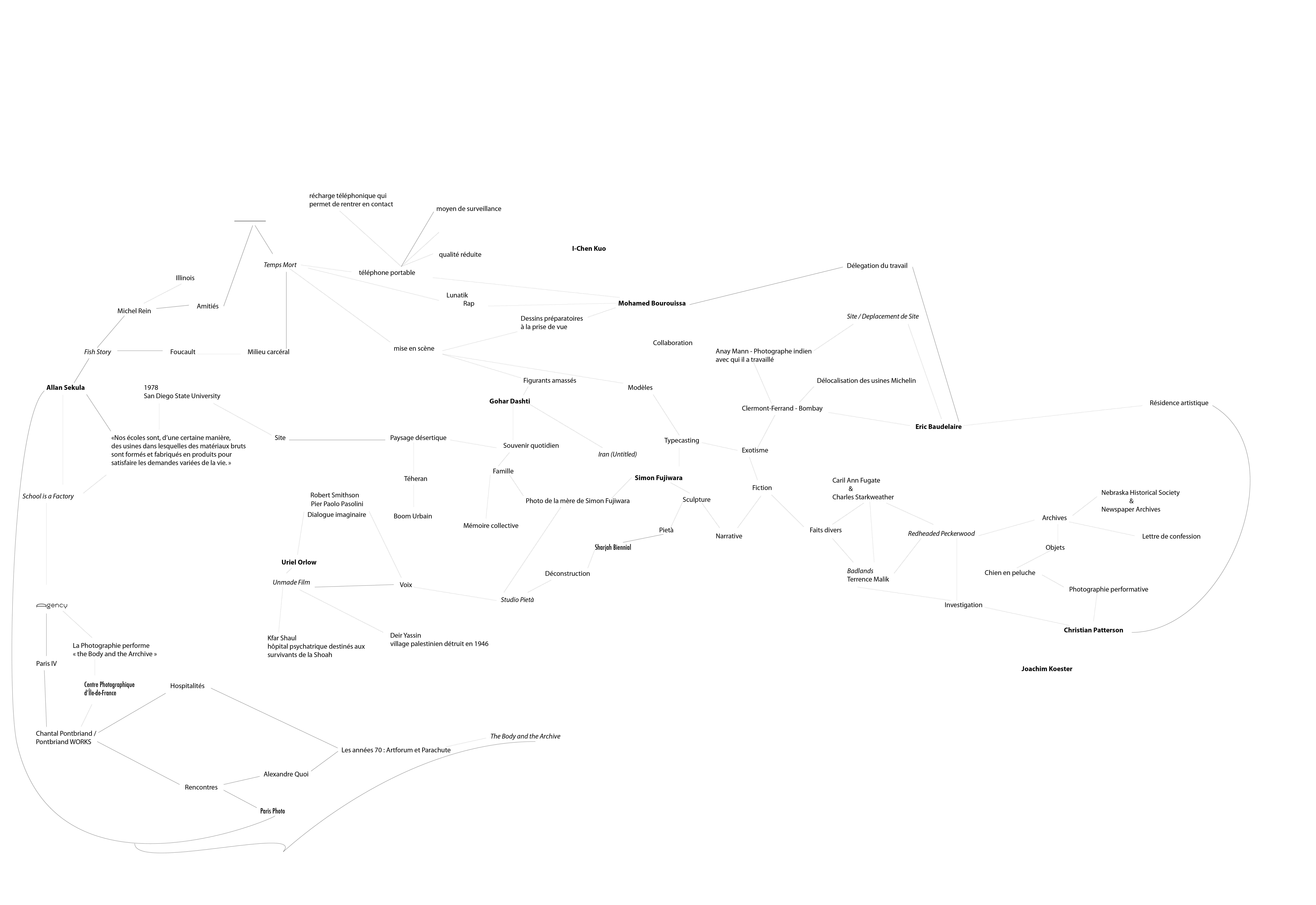 Cette constellation de mots clé a été réalisée en collaboration avec l’artiste français Franck Leibovici qui travaille depuis plusieurs années sur une série de cartes permettant de mettre en évidence l’écologie d’une oeuvre d’art ou de la carrière d’un artiste.